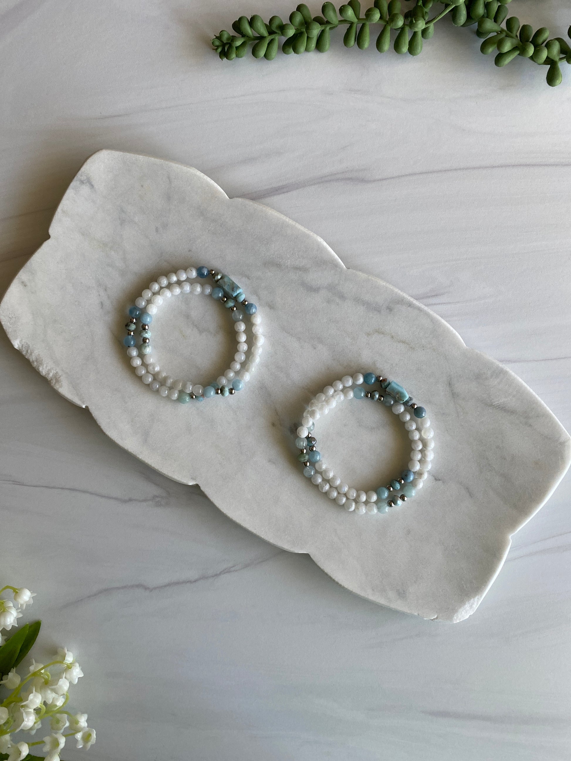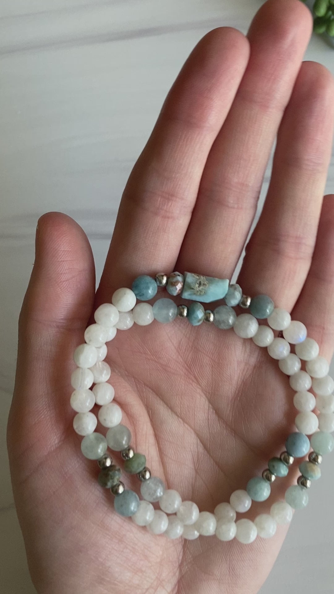 Treat your loved one to the gift of serenity and style with our Moonstone Aquamarine Larimar wrap bracelet. Perfect for everyday wear or special occasions, this bracelet is sure to elevate any outfit and uplift the spirit and awaken your divine feminine.